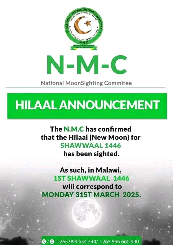 National Moon Sighting Committee (NMC) has announced that the moon of Shawwal has been sighted in Malawi. This means the country will observe Eid-ul-Fitr tomorrow, March 31, 2025, marking the end of fasting in month of Ramadan.According to Islamic religion, the sighting of the new moon is often a time for celebration, reflection and renewal.